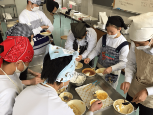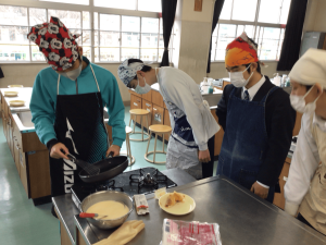 食べたい物と値段を考えて、自分たちで材料を買い出しに行きました。先生方に手伝っていただきながら、自分たちで生地を作り、きれいに焼くことができました。