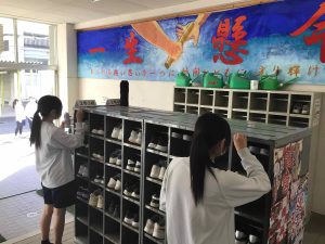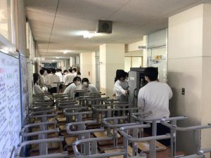 机や椅子の脚にたまったホコリを落としたり、机やテレビを廊下に出して床をピカピカに磨いたり、扇風機やエアコンのフィルターを洗ったりと、校舎への「ありがとう」の気持ちを込めて、生徒たちはみんなで協力しながら取り組んでいました。