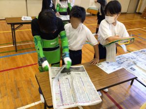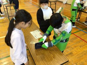 5年生が高齢者体験をしました。体に装具、目にはゴーグルをつけ、歩いたりお金を財布から出したりする体験をしました。高齢者の方の感覚を疑似体験することで、相手の気持ちを尊重して接していくことの大切さを学びました。次は、ファミリーケア島さんを訪問し、高齢者の方と交流をする予定です。