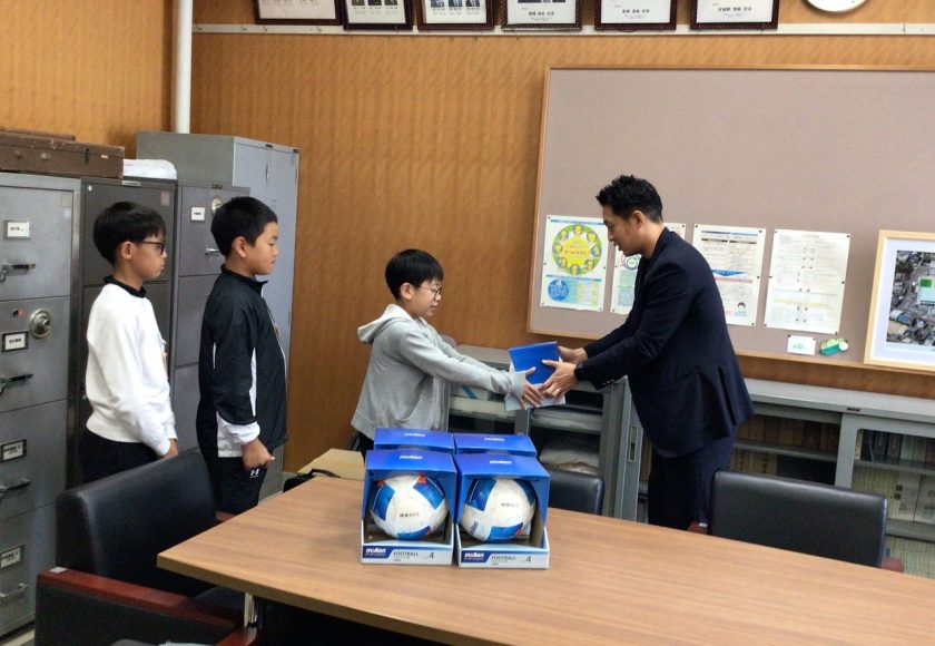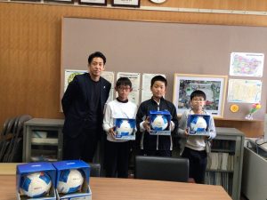 11月27日、FCぎふの庄司悦大スクールコーチと広報の方からサッカーボール5つ寄贈していただきました。6年生の児童が代表して受け取りました。授業などで、大切に使わせていただきます。ありがとうございました。