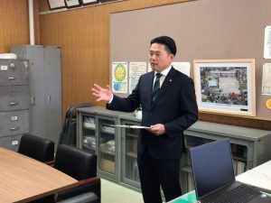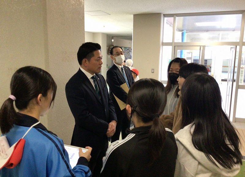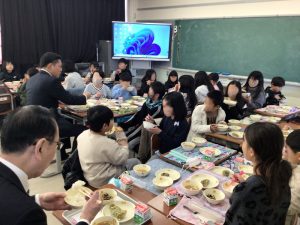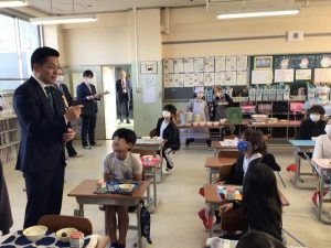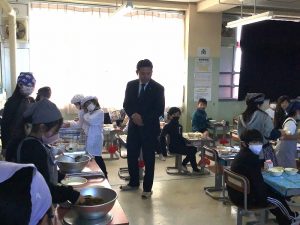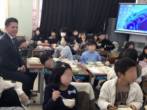 12月12日 柴橋市長さんが島小学校へいらっしゃいました。玄関では体育の授業帰りの6年生に声をかけてくださいました。子どもたちは突然の出会いに大興奮。その後、市長さんは給食配膳の様子を参観され、4年1組にて子どもたちと給食を召し上がられました。4年生の子どもたちは、自分の得意なことを披露したり、市長さんに質問したりして、楽しいひと時を過ごしたようです。中には「〇〇してほしいです。」と要望を伝えて子もいてびっくり。政治について考えるきっかけにもなりました。全校児童からの質問に応えるビデオまで撮影させていただきました。すてきな出会いに感謝です。