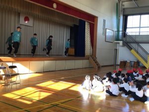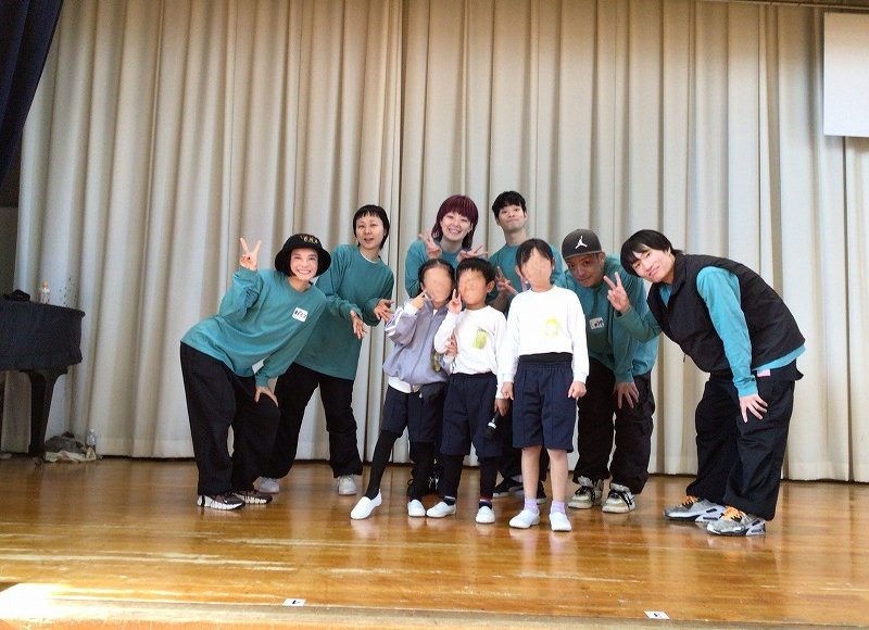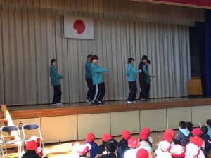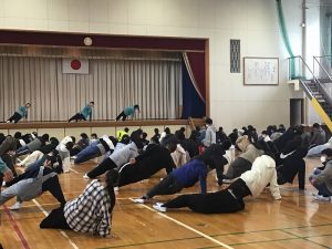 12月16日17日に、文化庁芸術家派遣事業「ダンス教室」を実施しました。東京から6名のダンス講師の方においでいただき、各学年ごとにダンスの基礎を教わりました。「ダウン」「ランニングマン」「ブレイクダンス」など、様々な動きをわかりやすく楽しく教えていただき、最後にはみんな一緒にかっこよく踊りポーズを決めました。体を動かすと血行がよくなり、頭もよくなるとのこと。ぜひおうちでも体を動かす楽しさを味わってほしいと思います。