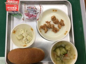 今日は12月24日、クリスマスイブです。教室にいくと、サンタさんがくるのは24日なのか25日なのかでもめていました。「うちはもうきたよ。」と話す子もいました。みんなサンタさんからのプレゼントを楽しみにしていることがわかりました。さて、今日の給食は、クリスマスメニューです。牛乳、コッペパン、フライドチキン、かぶのスープ、グリーンポテト、そしてデザートはアレルゲンフリーのガトーショコラです。みんなでおいしくいただきました。