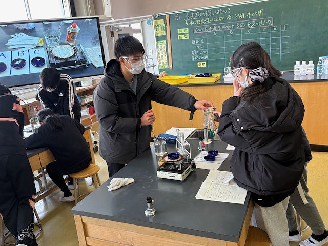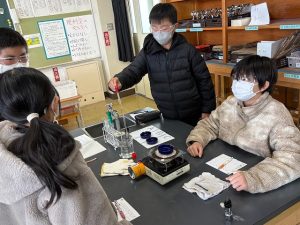 大雪予報でしたが、そこまでの積雪はなく一安心です。職員は朝早くから雪どけをし、子どもたちの登校を待ちました。さて、6年生では保護メガネをつけて理科の実験をしていました。食塩水、重曹水、アンモニア水、塩酸、炭酸水。見ただけでは何かわからない水溶液をいろいろな方法で調べていました。答えはわかったかな? 実験をする姿は、なかなかさまになっています。