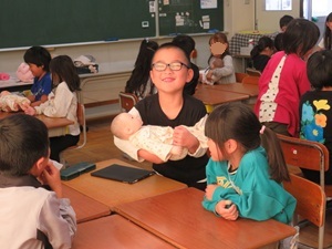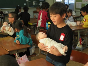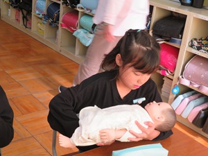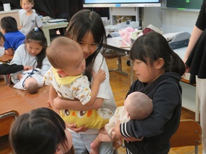生まれてきた赤ちゃんと同じくらいの重さの赤ちゃん人形を一人一人抱っこしました。