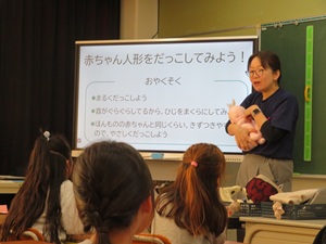 赤ちゃん人形をだきながら、大切に産んで育ててくれたお母さんに感謝の気持ちをもつことができました。