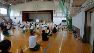 先生の説明を聞いた後、一人一人が叩き台に向かって、先生の手本を見ながら練習をしました。6年生は去年も演技を披露しているので、自信をもって叩き台を打っていました。腕を斜めに上げるところでは、腕がまっすぐに、しかも角度もそろって伸びていたことが素晴らしかったです。