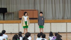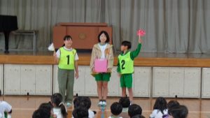10月22日、進行係が中心となって、結団式を行いました。まず、今年のスローガン「一人一人が主役、笑顔あふれる運動会」が発表されました。その後、団色を決めました。1組、2組それぞれの代表の子が記事を引いて、1組が白団、2組が赤団と決まりました。