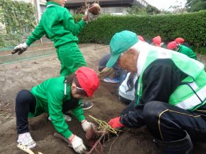 今日10月24日(金)、2年生が学校の畑で育てたさつまいもを収穫しました。