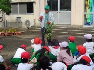 芋を掘る前に、見守り隊や学校菜園のお世話でご協力いただいている吉田 徹 様から、収穫に当たっての注意を伺いました。