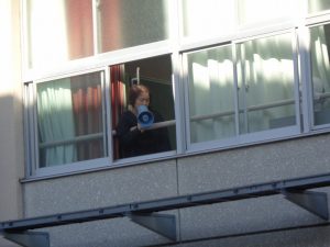 また、今回の訓練は、校内の電源が落ちてしまったという想定で行ったため、安否確認や被害状況の確認、避難指示といった職員間の情報伝達は、校内放送や内線電話を使用せず、先生たちの肉声やハンディタイプの拡声器、ジェスチャーなどで行いました。