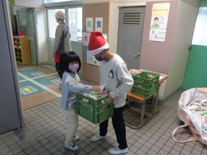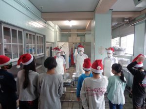 各学級から食器や牛乳パックが給食室に運び込まれると、元気よく「メリークリスマス!」と言ってそれを受け取ります。
