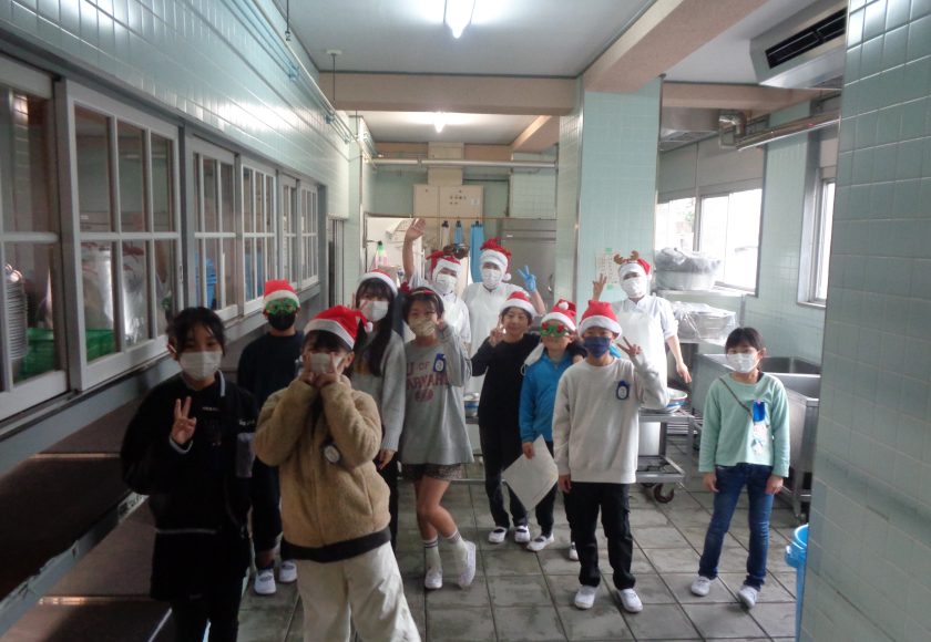今日は12月25日。毎日、給食後、給食室で片付け作業を行う給食委員。今日はサンタさんになって仕事をしました。