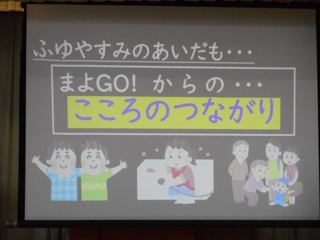 校長先生は、12月10日の「ひびきあい集会」(第2ブロック学校人権教育研究会として公開)を見ていただいた岐北中学校の安達校長先生が書いてくださった「あったかメモ」を紹介しながら、「これまでのみんなの『まよGO!』が心のつながりを生んでいます。冬休み中も冬休み後も、この『まよGO!』からの心のつながりを大切にしてください。」とメッセージを送りました。