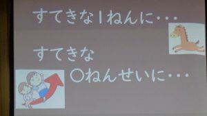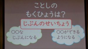 次に、校長先生からのお話を聞きました。新しい年になりましたので、目標を決め、その目標に向かって、3月の終わりを目指して頑張りましょうという話でした。目標を決める時には、挑戦する気持ちを大切にします。自分の成長のために、ちょっと大変なことにも挑戦できるといいですね。目標を決めたら、実行します。その時に大切なのは、やっぱり「まよGO!」です。