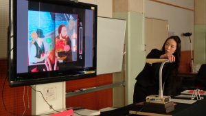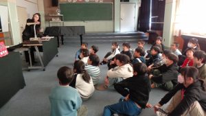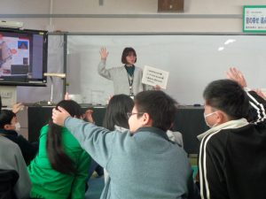 1月20日(火)、21日(水)に岐阜市立図書館(ぎふメディアコスモス内)から浅野様、上野様、後藤様にお越しいただき、4~6年生を対象に「ブックトーク」をしていただきました。「ブックトーク」とは、あるテーマに関わる数冊の本を集め、それらを1冊1冊区切らずにつなげて紹介するものです。今回のテーマは、「どっち!?」「旅に出る」でした。