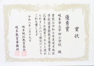 この度、早田小学校が「令和7年度岐阜地区学校図書館教育優秀賞」を受賞しました。