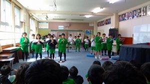 その後、それぞれの学級が「鉄腕アトム」を合奏しました。いろいろな楽器の音が合っていて、どちらの学級も、元気が感じられる演奏でした。この1年間、それぞれの学級で、仲間と心を通わせてきたことがすごく伝わってくる演奏でした。
