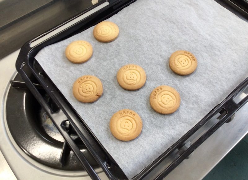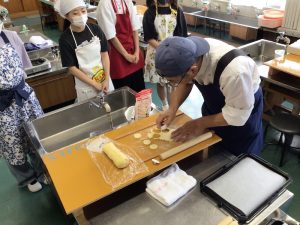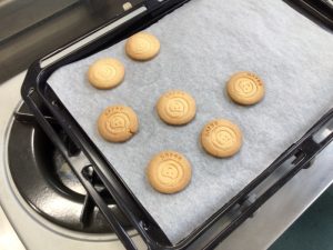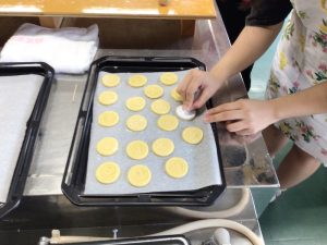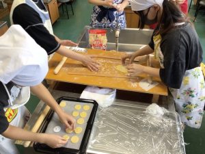 先日のマイタイムの時間に、地域の洋菓子屋さんのパティシエの方を講師にお招きして、クッキーの作り方を教えていただきました。初めにクッキーづくりの工程をお話しいただきました。クッキー生地を均一に伸ばす時のポイントや道具の使い方、また生地が室温で溶けて柔らかくなってきたときの対応方法などを教えていただきました。お話を聞いた後、実際にみんなで作業をしました。大きい生地の塊から適量切り分け、粉を振った台の上に置き、めん棒で丁寧に伸ばしていきました。伸ばした生地を丸い型を使ってくり抜き、その生地の上から模様の型をスタンプのように押していきました。時間が経って柔らかくなってきた生地は、冷凍後に入れてもう一度固めたり、次の作業までに時間があるときには冷蔵庫に生地を入れて冷やしたりしておくなど、ゆっくり丁寧に作業を進めました。オーブンを使う時には、焼きムラができないように、天板を入れ替えるとよいこともわかりました。出来上がったクッキーは、とてもいい焼き色で模様もきれいに表れていて、とてもおいしかったです。試食してもらった人達からも「とてもおいしい」「見た目もかわいい」と感想をいただきました。17日に行われる『徹明×草潤ふれあいフェス』 でも今回と同じ生地でクッキーを焼き、フェスに参加していただいた地域の方にもおやつとして食べていただく予定です。どんな感想をいただけるのか楽しみです。