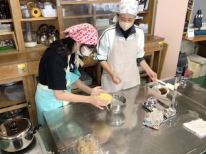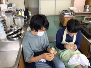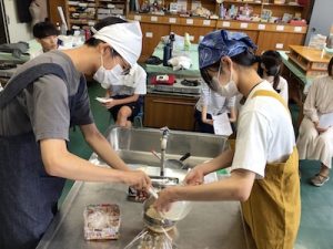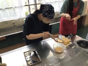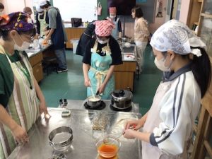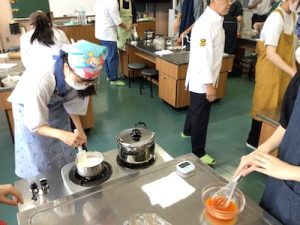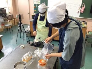 初めに、なめらかプリンを作る手順を教えていただきました。工程の一つ一つの中に、なめらかにするポイントがあることを教えていただき、自分たちが作るときにはポイントを確かめながら作業をしました。また、講師の先生が「お菓子を食べる人の顔を想像し、その人が幸せになることをイメージしながら作る」ということも話されたので、生徒たちも食べてくれる人のことを想像しながら、まず自分たちが楽しみながらプリンを作ることを大切にしていました。そのほかにも、使用する食材を選ぶ際のエピソードや、なぜその食材を選んだのかというこだわりについても教えていただき、驚きや感動もたくさんありました。プロから本物を学ぶことができ、充実した時間になりました。3年生が作ったなめらかプリンを1・2年生の生徒にも食べてもらいました。先輩が作ったプリンを「おいしい。」といって笑顔で食べている姿が印象的でした。