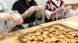 11月23日(日曜日・祝日)に、徹明公民館で行われる「徹明地域文化祭」で草潤中オリジナルクッキーを販売します。クッキーには先輩がデザインした草潤中のマスコット「森川ウミちゃんがデザインされています。プレーン味で、1袋に3枚クッキーが入って150円(税込み)です。