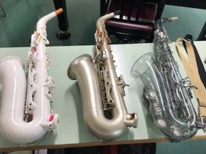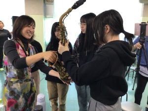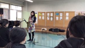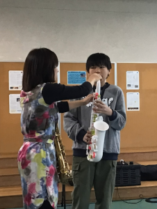 岐阜市の「アートライブ・ウェルカム!アーティスト」事業で、サックス演奏者の粥川なつ紀さんを講師にお招きしました。13歳よりサックスを始められ、演奏活動のほかにも楽団の音楽監督やラジオやCATVなどでMCを務められるなど幅広く活躍していらっしゃいます。当日は粥川さんの楽しいお話やサックス演奏を聴かせてもらうだけでなく、希望者にはサックスを吹かせてもらえるチャンスもありました。講師の先生から息の使い方を教えていただき実際に吹いてみました。コツをつかんだら音が出るようになり、講師の先生とコラボして「きらきら星」の演奏まで楽しむことができました。生徒からは、「サックスの音を生で聞くことができてよかった。」「サックスを初めて聞いて感動しました。凄かったです。」「楽器を製作した技術者や弾き手の努力を垣間見ることができました。演奏者や先人たちリスペクトする気持ちになる、そんな貴重な体験になりました。」という感想が聞かれました。