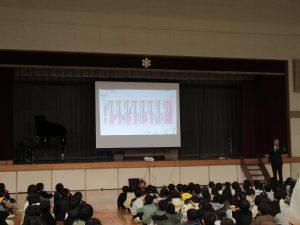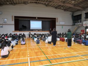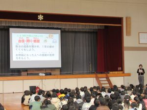 2時間目に冬休み明け集会がありました。まず、校長先生からは冬休み前のお話に引き続いて、「自分の目標をもち、夢をかかげて一つ上の自分へ」とお話がありました。そして、年末に地域の方々(木之本長寿会の皆さん)が朝寒い中、学校の周りをボランティアで掃除してきれいにしてくださっている姿について紹介され、このように落ちているごみを自分から進んで拾えるみんなであってほしいとも話されました。