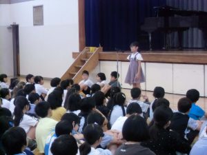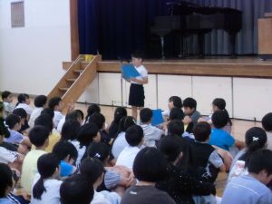全校で校歌を歌い、校長先生や1年生、4年生の代表児童の話を聞きました。校長先生からの話の中に運動会の話がありました。運動会スローガンには”全力”の文字があります。どんな結果になっても努力すること、全力で取り組むことが大事だという話でした。また、代表の仲間は、前期に頑張ったことをもとにして、後期は勉強を頑張ったり、挙手を頑張ったりしたいなど、それぞれの目標を話してくれました。後期の係が決まり、学習も生活もいよいよスタートします。目標に向けて全力で努力をしていきたいですね。