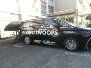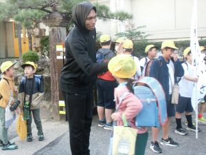 11月4日、朝のあいさつ運動は、ボランティアの児童とPTAの方々に加え、岐阜スゥープスの選手も参加して行いました。