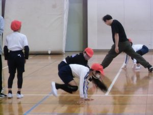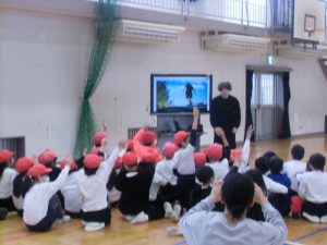 今回の講師はパルクールで日本チャンピオンになった経験のある木本さん(株式会社スペモン)です。「好きを仕事にするとは」「パルクールとは」など、自身の経験をもとにしたお話を聞き、キャリア学習を行いました。挑戦すること、やっているといろいろなつながりができてくること、時にはあきらめることに必要なことなど、競技を通した仕事への考え方を学びました。その後、講師の先生方によるデモンストレーションを観ました。跳び箱を華麗に飛び越したり、2階の卓球室から1階のフロアに飛び降りたりする様子を見学しました。一つ一つの技に大きな歓声をあげていました。デモンストレーションには、パルクールで活躍している4年生の仲間も参加しました。