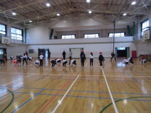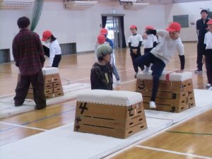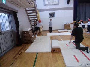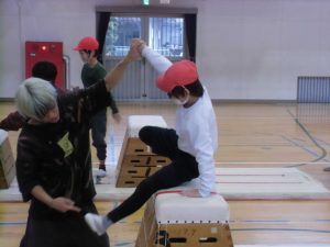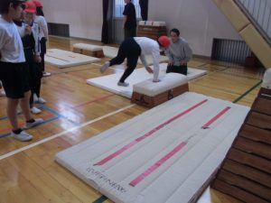 3,4時間目は1組2組に分かれてパルクール体験をしました。ウォーミングアップの後、跳び箱を使った技をいくつか教えてもらいました。跳び箱を飛び越すだけでもいろいろな技があり、連続して進むとなかなかかっこよくきまります。