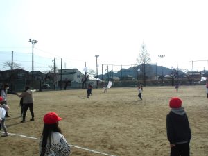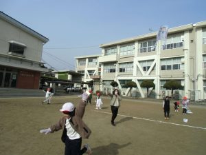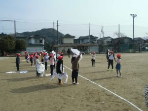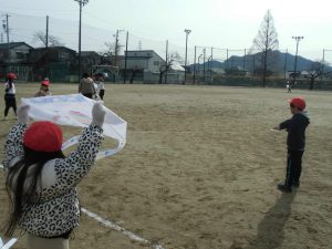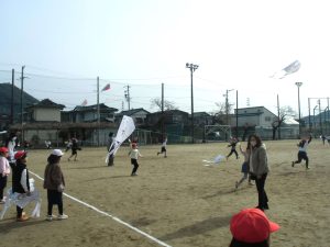 たこを支える人とたこをあげる人が息を合わせて合図を送り合い、あげる人が走り始めると同時に支える人が手を放します。するとたこはするすると空にあがっていきました。運動場の端を目指して走っていくと上手くあがる仲間もいれば、途中で落下する仲間もいました。何度も挑戦しながらたこあげを楽しみました。