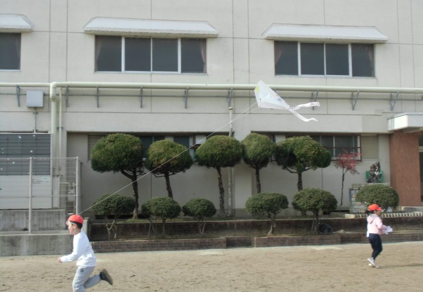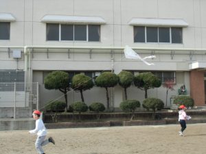 1年生が生活科の授業で「たこ」を作成しました。今日は、それぞれが作った「たこ」を運動場であげました。