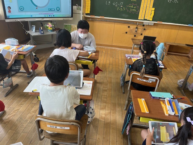 2年生、算数「2けたのひき算」ブロックを操作して答えの導き出し方を考えていました。操作するブロックの写真をタブレットで撮影し、その写真を使って友だちに考え方の説明を指していました。