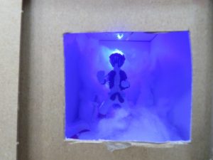 箱の上から光を当てると、今まで見えていた世界とは違う雰囲気の世界が広がります。なんだか幻想的・・・。 友達の作品を覗くときもワクワクしますね。