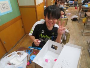 5年生図工「のぞいてみると」です。箱の中という限られた空間に自分だけの世界を作っていました。『穴』という限定的な視野から見える形や色に着目しながら、作品作りに集中して取り組んでいました。