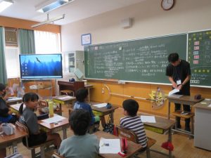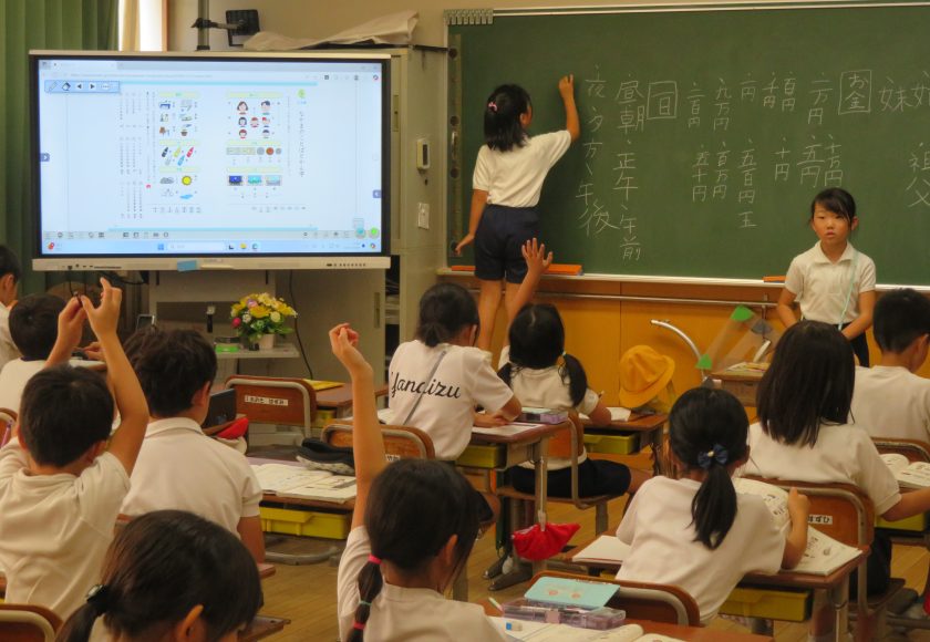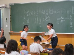 2年生国語「なかまのことばとかん字」です。家の人、お金、一日など、ジャンルを決めて、そのグループに入る言葉を漢字で書く練習です。進んで挙手をして、自分たちで学習を進めていました。