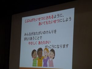 話の中で「人権」についてふれられました。人が生まれながらにして持っている権利・・・分かりやすく言うと、「してもいいこと」「守られていること」例を挙げると、『いじめられないこと』『自分の考えを言えること』『安全に暮らせること』『学校に行けること』『自分らしく生きられること』誰もが守られるべきことです。ただ、この権利を間違ってとらえてしまうと、かえって相手にいやな思いをさせてしまったり傷つけてしまったりすることもあります。「これって、してもいいことなのかな?」と自分に問いかけながら、自分の権利だけでなく相手の権利も大切にできる、やさしくてあたたかい柳津小学校にしていこうと言われました。