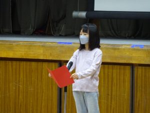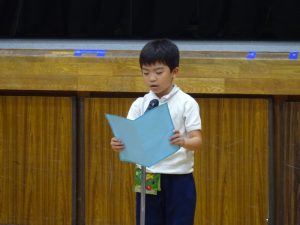 児童代表の言葉は、2年生と4年生でした。2年生の子は、前期からがんばってきた自主学習について話しました。後期も漢字の学習をはじめとして自主学習を続け、特に、誰かに言われることなく自分から進んで学習していけるようにしたいと話してくれました。