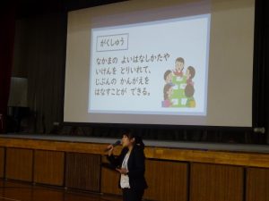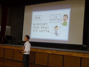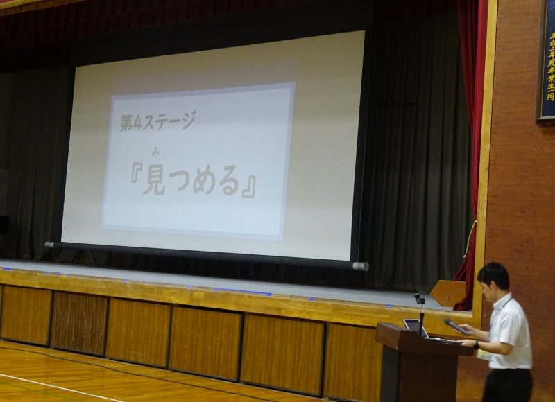 最後に、今日から始まった4thステージについて生徒指導の先生から話がありました。学習、健康、仲間の3つについて、それそれ担当の先生からがんばってほしいことについて、分かりやすく子どもたちに話されました。この話を聞きながら、後期にがんばることを決めたことと思います。