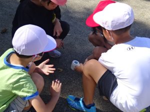 3年生が理科で「太陽とかげ」の学習をしています。「かげ」って、普通に見かけるもので、「かげふみ」をして遊ぶ以外は、そんなに意識したことはないかもしれないですね。「かげは後ろにできるよ」「太陽に背を向けたら、前にできるよ」「夕方は足が長くなるんだよ」「どこまでいってもかげはついてくるんだよ」実験前の話し合いはかなり盛り上がりました。じゃあ、それを実験ではっきりさせよう!といういことで、2時間おきくらいに、かげの向きと長さ、そのときの太陽の位置を記録することになりました。