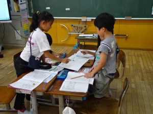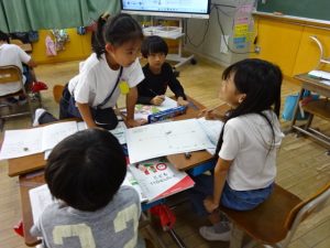 3年生の子どもたち、話し合いの仕方がどんどん上手になっています。今日も、結果の図を指し示しながら、自分の考えを話すことができていました。何について話しているのかが分かると、聞く側の聞き方も変わってきますね。お互いに考えを言い合うことで、「太陽が東の空から上がり、南の高い空を通って西の空に沈んでいくからだ。日光の当たり方が変わってくるからかげの長さがかわるんだ」という結論を、自分たちで導き出していました。