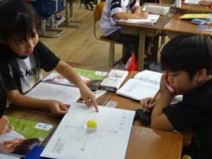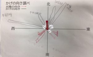 実験結果をグループで見ながら、かげは一日の間に西から北へ、そして北から東へと動いていくことを確かめました。そして、ただ動いていくだけでなく、朝から昼にかけてだんだんと短くなっていき、昼過ぎから夕方にかけて再び長くなっていくことも確かめました。その後、何でそうなったのかな?をグループの仲間と話し合いました。
