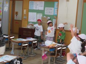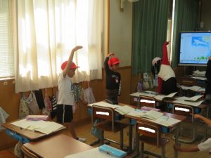 1年生 国語「くじらぐも」の様子です。くじらぐも役と運動場で体操をしている子ども役に分かれて、場面の様子を表現していました。先生の音読に合わせて、大きなくじらぐもがやってきて、子どもたちと一緒に体操をするという楽しい場面です。お話の内容がよく分かっているからこそ、楽しく表現できますね。