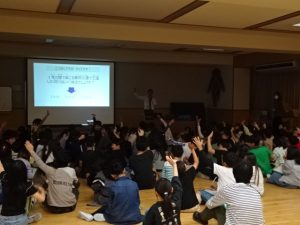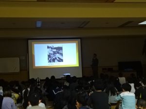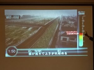 3時間目には、4年生の子どもたちがアルファパートナーの方にお越しいただき、防災授業を受けました。CGで作られた水害の動画では、1時間に30mmの大雨が降ると、1時間ほどの間にみるみる川の水位が上がり堤防が切れて住宅地に水が流れ込んでいくことが分かりました。水害の恐ろしさと水害に備えるためにはどうするとよいか学ぶことができました。