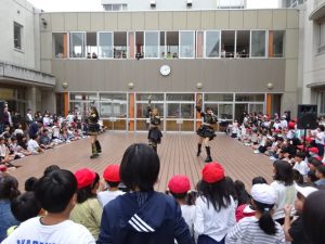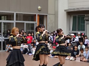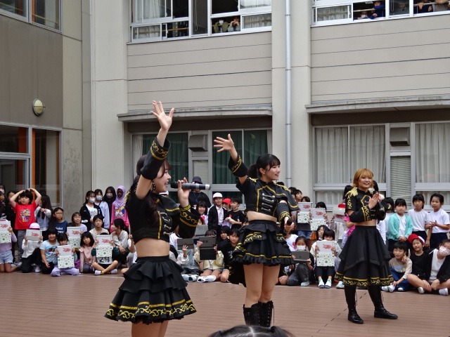 昼休みには、11月9日に柳津天神神社で行われる「第2回 柳津祭り」の宣伝のために、岐阜のアイドル『蜂蜜★皇帝(ハチミツエンペラー)』が柳津小に来てくれました。中庭のなかよしステージでミニライブがあり、たくさんの子どもたちが大興奮でライブを楽しみました。