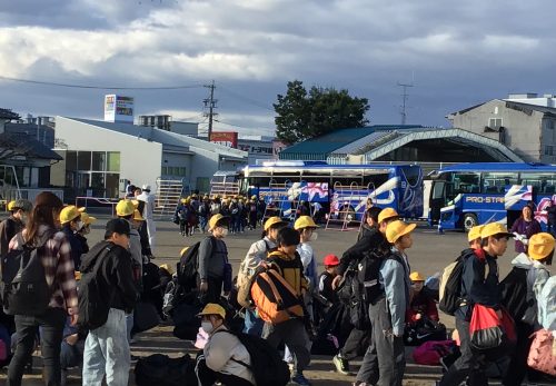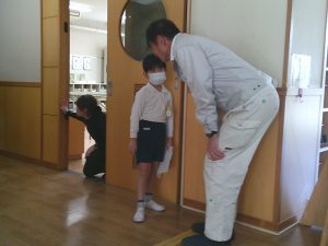 今日は、出来上がった作品を、昨年の「ネコバス」づくりのときに手伝ってくれた校務員さんに見せようと、教室にお誘いしました。作品の紹介をしたり、一緒に写真を撮ったりして校務員さんもほっこり笑顔になっていました。