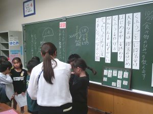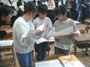 調べたことを話すのではなく、より相手に伝わる文章にするのが課題です。話す順番や、接続詞の使い方などについて仲間と意欲的に交流し合いながら文章を作ることができました。