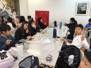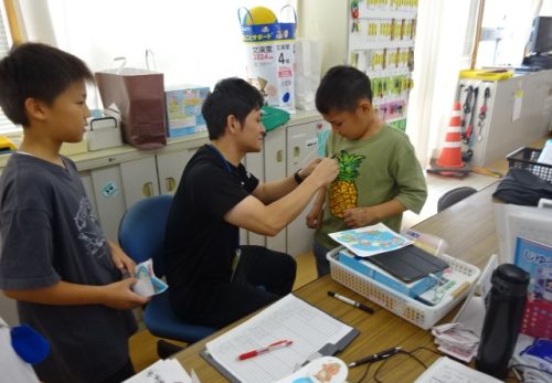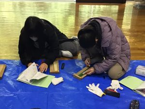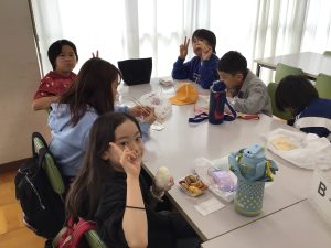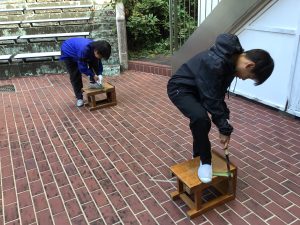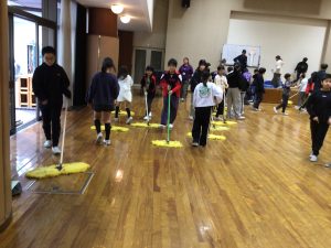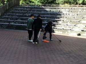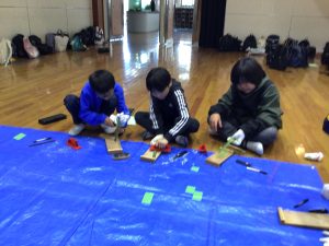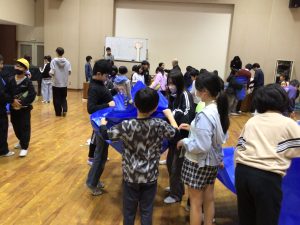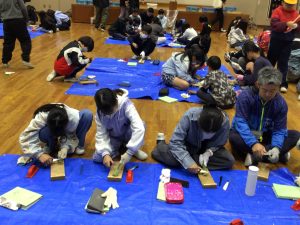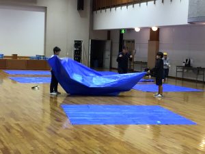 活動の後片付けもみんなで協力してすばやくできました。ブルーシートの畳み方も教えてもらったことを思い出してみんなできれいに畳めました。クラフトの掃除担当の子たちは、モップでホールを何周もまわり、竹の削りかすが残らないように隅々まできれいにしていました。