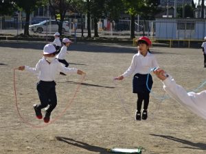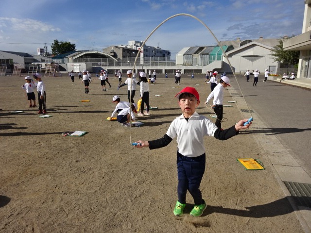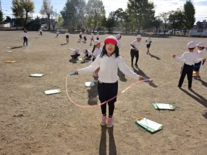 1年生が、運動場で体育の授業を行っていました。縄跳びの学習が始まったようです。「保育園の時からがんばっていたから、1分間で40回も跳べるよ」と、かっこよく跳ぶ姿を見せてくれました。前跳びだけじゃなく、後ろ跳びやかけ足跳び、片足跳びも上手にできていました。
